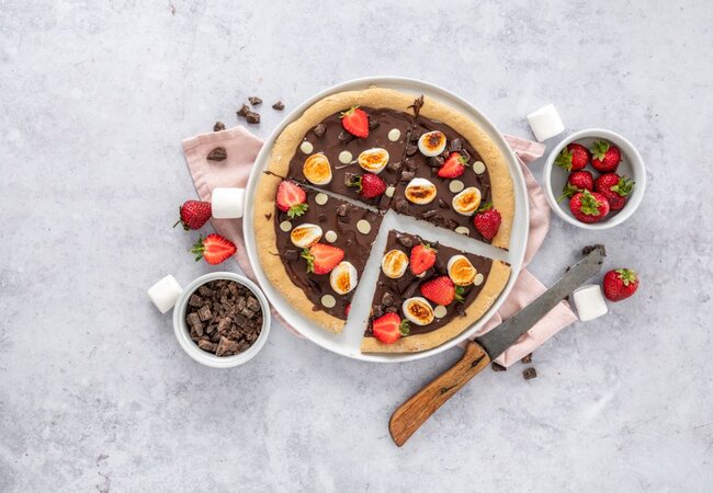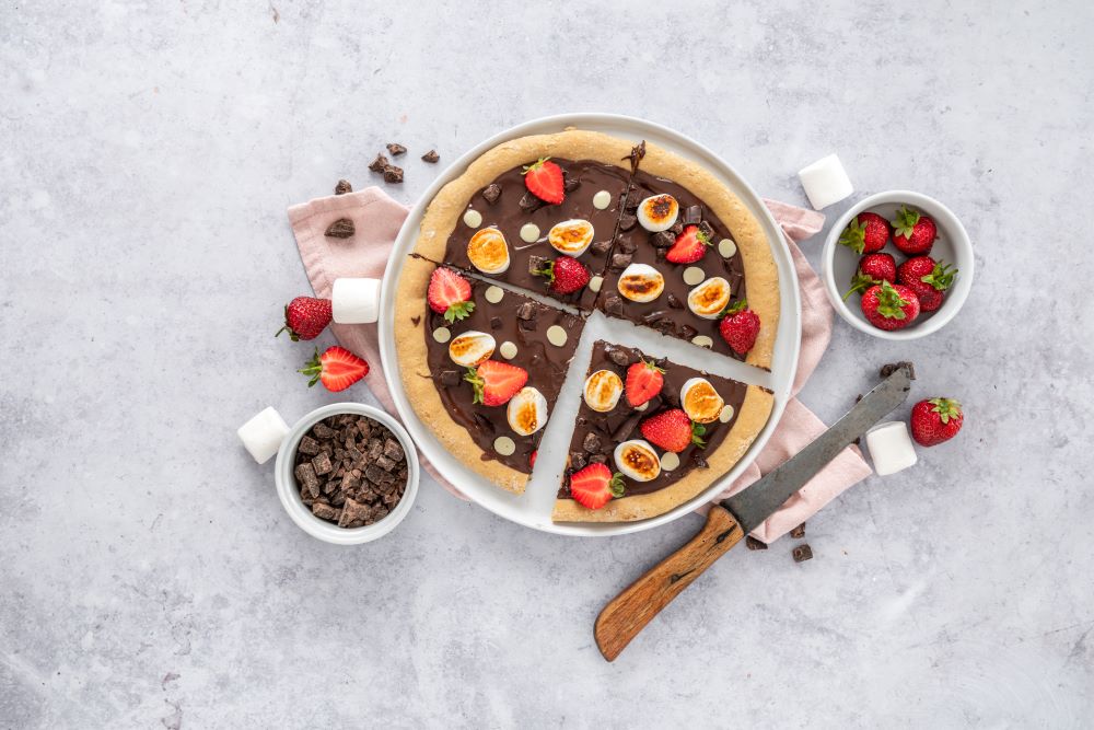 Die Pizza wieder in den Ofen geben und so lange backen, bis die Marshmallows goldbraun sind. Vor dem Servieren mit frischen Beeren belegen.