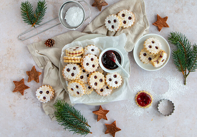 Die fertig gebackenen Plätzchen aus dem Ofen nehmen. Auf die geschlossenen Plätzchen je einen kleinen Klecks Johannisbeergelee geben und mit einem Plätzchen mit Löchern zusammensetzen.