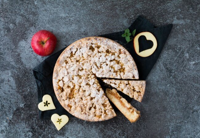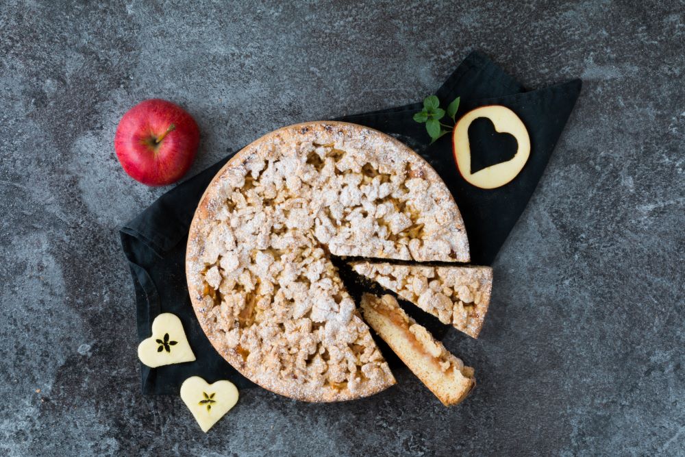Äpfel waschen,entkernen und fein reiben. Apfelraspel auf dem Kuchenteig verteilen. Das restliche Drittel Teig als Streusel auf dem Belag verteilen. Bei 175 °C für ca. 45 Minuten backen.