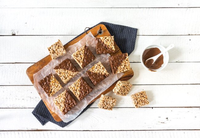 Die Haferpop-Krispies in kleine Quadrate schneiden. Die Schokolade im Wasserbad oder in der Mikrowelle schmelzen und die Krispies nach Belieben damit verzieren.