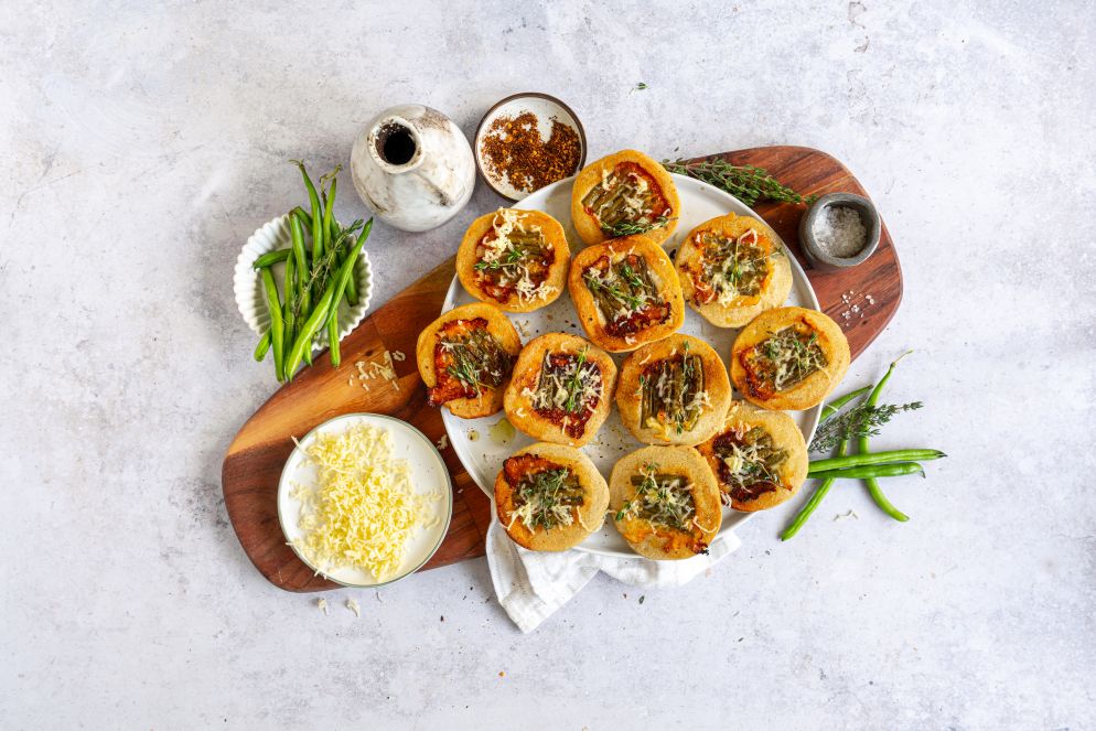 Den Pizzateig nach Packungsanleitung zubereiten und in 12 gleich große Portionen teilen. Ein Blech mit Backpapier belegen und den Ofen auf 220°C Ober-/Unterhitze vorheizen.