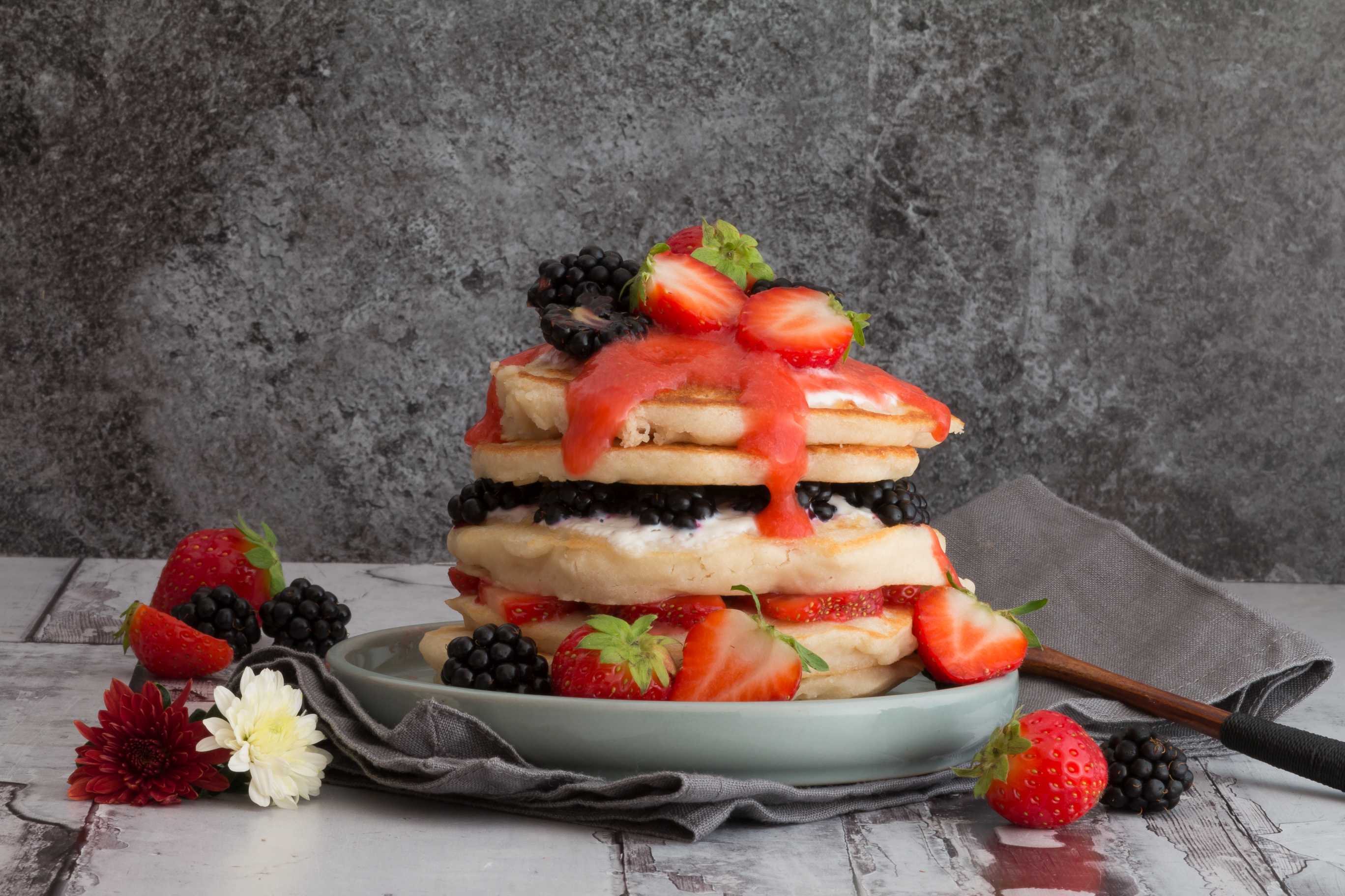 " 1 Packung Bauck Waffel- und Pfannkuchen Mix glutenfrei" , " 200 ml Haferdrink" , " 200 g Sojajoghurt" , " 1 EL Ahornsirup" , " 300 g Erdbeeren" , " 1 Handvoll Brombeeren" , " 2 TL Kokosöl"