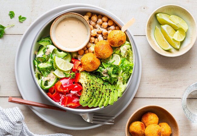 Vegane Süßkartoffel-Falafel-Bowl mit buntem Gemüse