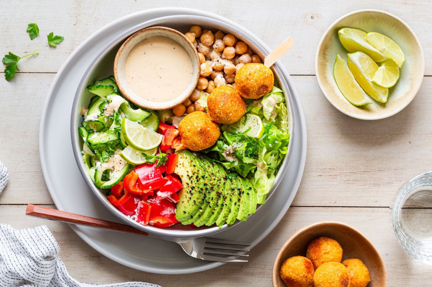 Das geschnittene Gemüse mit den kross gebratenen Süßkartoffel-Falafel und dem Erdnussdip anrichten und mit Petersilie bestreut servieren.