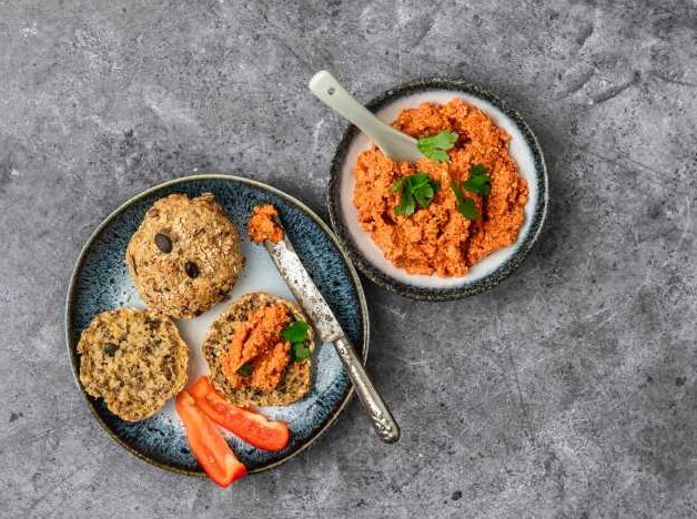 Die Paprika aus dem Ofen nehmen, häuten und entkernen. Das Fruchtfleisch zusammen mit den restlichen Zutaten in einen Mixer geben oder mit einem Pürierstab zerkleinern.
