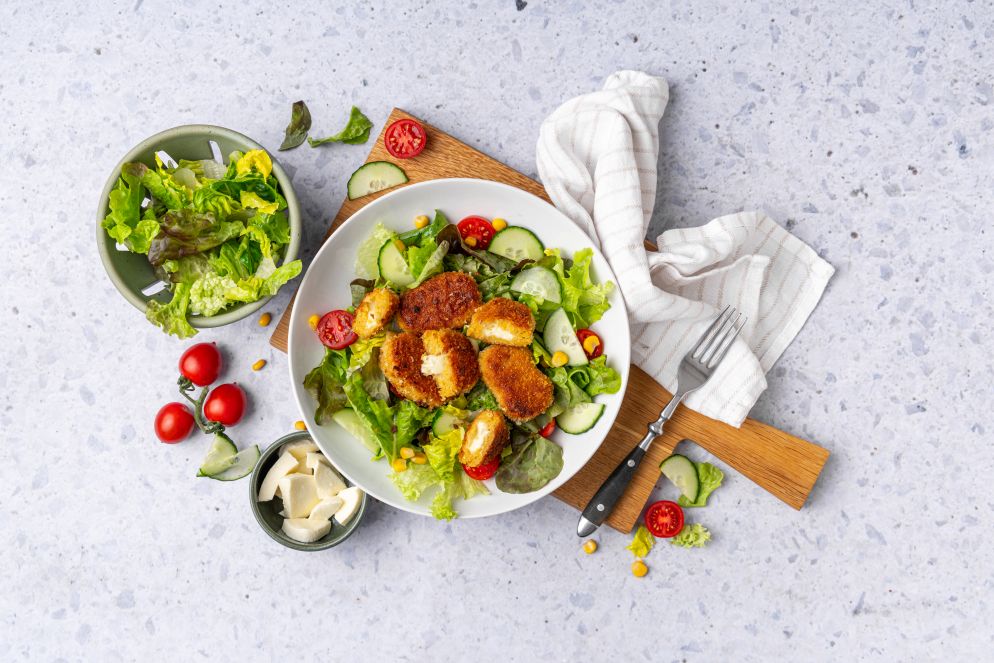 " 1 x Bauck GoldNuggets" , " 1 Kugel Mozzarella" , " Semmelbrösel" , " Öl zum Ausbacken" , " 1 Kopf Salat nach Wahl" , " 1/3 Gurke" , " Ein handvoll kl. Tomaten" , " 1 kl. Dose Mais" , " Salz, Pfeffer" , " 3 EL Essig" , " 3 EL Öl"