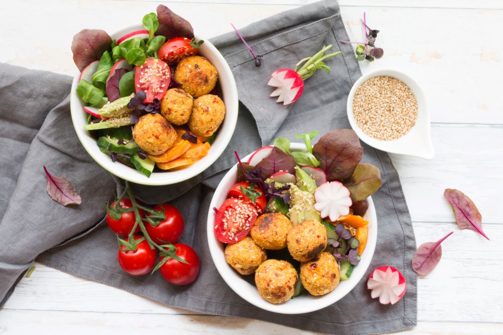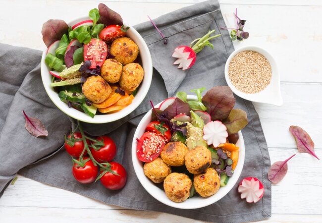 Salat mit Gemüse, Avocado und gerösteten Süßkartoffeln in Schüsseln anrichten, Falafelbällchen zugeben und mit Sesam bestreuen. Mit Joghurtsauce und nach Belieben Gemüsekresse garniert servieren.