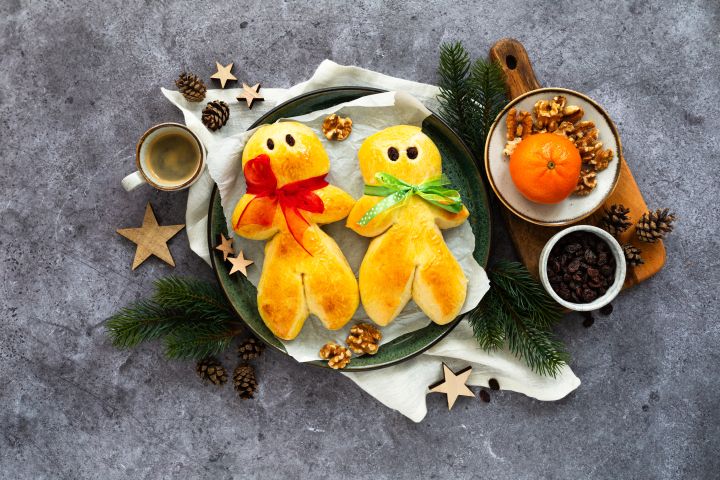 Teig auf einer bemehlten Arbeitsfläche in 4 Portionen teilen und jeden Teigling zuerst länglich formen, dann aus dem oberen Drittel einen runden Kopf formen. Für die Arme rechts und links den Teig einschneiden, für die Beine den Teig einmal mittig unten einschneiden. Die Weckmänner mit ausreichend Abstand auf ein mit Backpapier ausgelegtes Blech setzen, erneut abgedeckt ca. 20 Minuten gehen lassen.