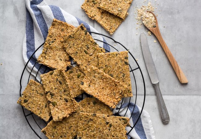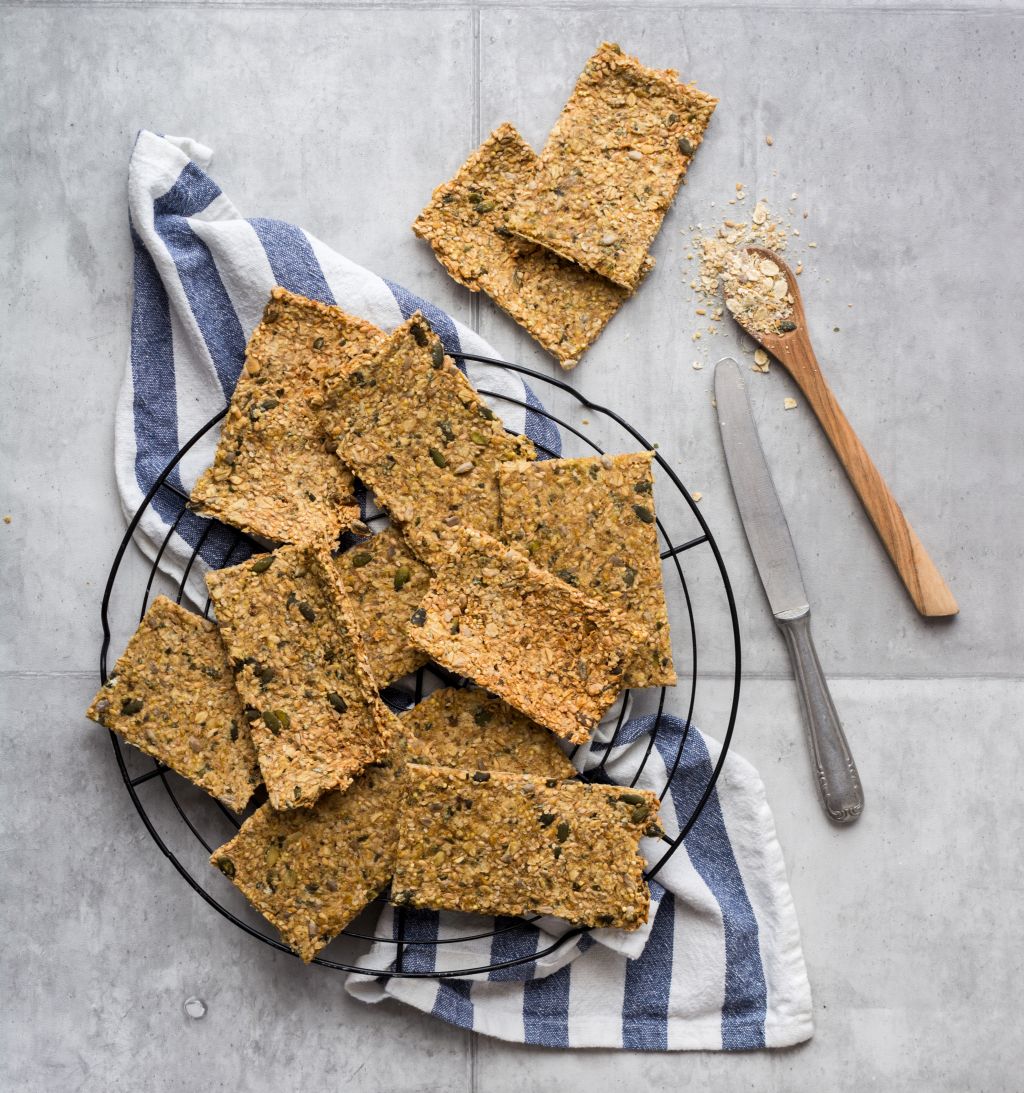 Den Teig in drei Teile teilen und zwischen Backpapierbögen dünn ausrollen. Die Teigplatten mit einem großen Messer quadratisch einkerben, sodass Sollbruchstellen in der gewünschten Größe entstehen. Die Bögen mit dem ausgerollten und eingekerbten Teig auf Bleche oder auch zusätzlich ein Gitterrost platzieren. Auf Wunsch mit etwas Sesam oder Meersalz bestreuen.