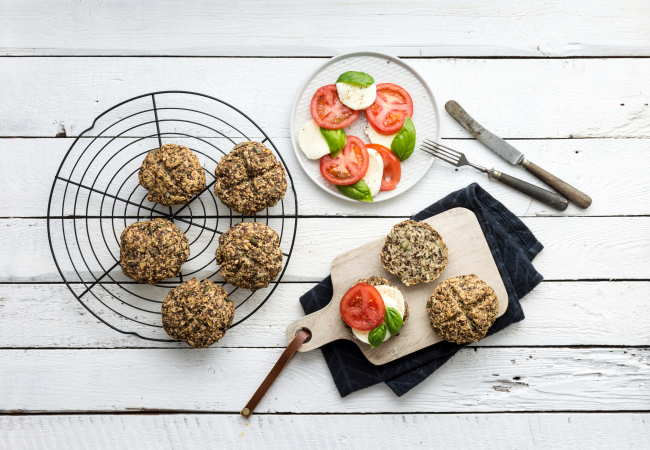 Den Ofen auf 200° Ober-/Unterhitze vorheizen. Aus dem Teig etwa tennisballgroße Portionen formen, etwas plattdrücken und auf einem Blech mit Backpapier legen. Die Brötchen mit einem scharfen Messer kreuzförmig einschneiden. Alles für etwa 45-50min backen.