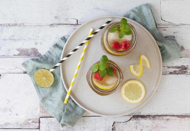 Den Eistee auf vier Gläser verteilen, die restlichen Eiswürfel zugeben und mit Minze, Himbeeren oder Granatapfelkernen garniert servieren. Gefrorene Himbeeren geben dem Getränk an der Stelle eine schöne pinke Farbe.